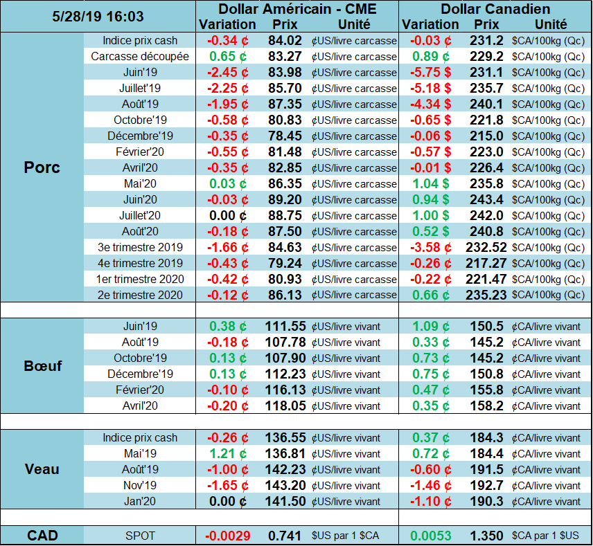 Les prix du porc continue de subir la sortie des fonds d’investissement de leurs contrats acheteurs et des producteurs voulant soudainement se protéger contre une baisse future des prix. Malgré tout, l’enthousiasme perdure sur les prix en 2020, mais cet enthousiasme semble se dissiper sur les échéances plus court terme (juin, juillet et août 2019). Les craintes relatives à la baisse du prix au comptant amorcée la semaine dernière ainsi que la baisse rapide du prix de la découpe sont les 2 raisons principales qui justifient le déclin des prix sur ces mois en particulier. Pour les ventes de vendredi, le prix cash reculait de -0.92 cent/lb à 82.85 ce qui donnera demain un indice CME de -0.71 à 83.31 cents. Après cette publication, les prix d’été étaient plus de -3.00 cents, sans oublier que les marchés ont terminé limit down vendredi. Au moins, le prix des découpes se redressent après une semaine difficile, en hausse de +2.69 cents/lb à 85.96 aujourd’hui.