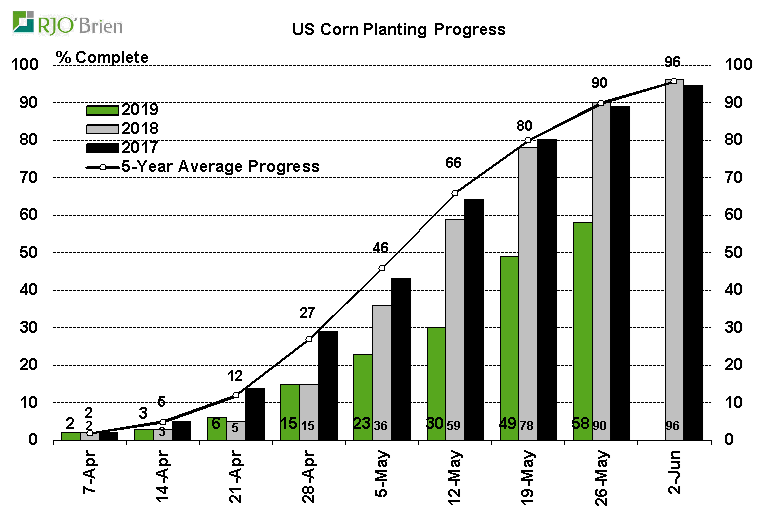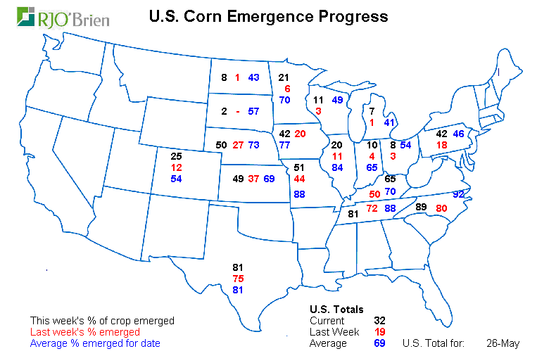 - Maïs semé à 58%, vs 49% la semaine dernière et 90% en moyenne.