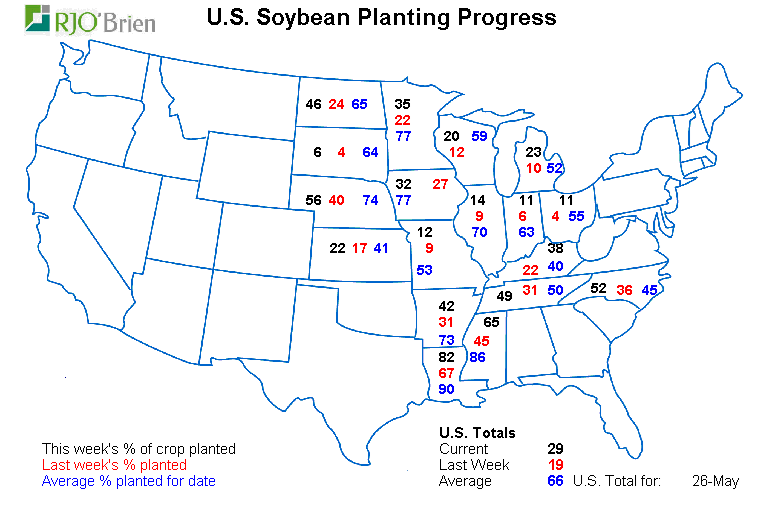 - Soja semé à 29%, vs 19% la semaine dernière et 66% en moyenne