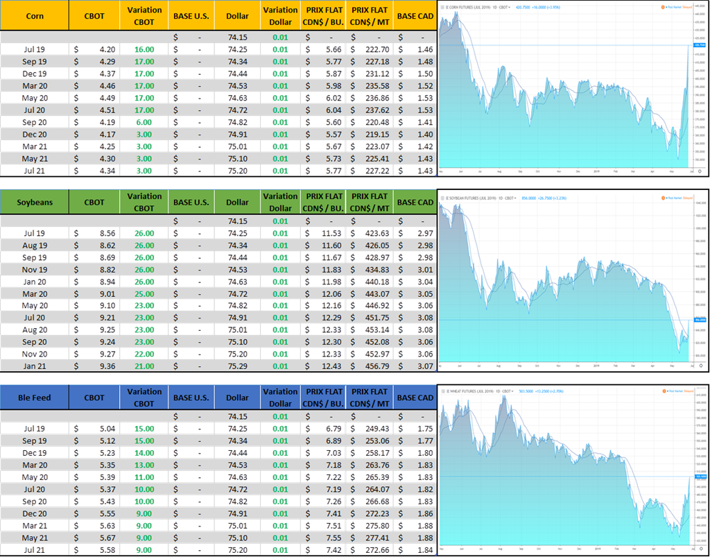 On parle ÉVIDEMMENT du retard dans les semis et la quasi-certitude d’une réduction de superficie aux États-Unis, mais il ne faut pas non plus oublier la forte probabilité d’un rendement plus faible. Premièrement ce qui est semé tardivement n’a pas le même potentiel de rendement – ce n’est pas une certitude, mais les probabilité sont élevés qu’un rendement soit plus faible pour ce qui est semé à partir d’aujourd’hui. Il va manquer de temps pour arriver à maturité, plus de risque de chaleur à l’été, plus de risque de gel rendu à l’automne, etc... On est loin d’être sorti du bois.