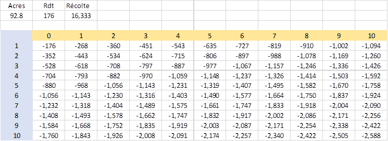 Je me suis fait un petit tableau maison pour illustrer l’impact sur la production d’une baisse de superficie (colonne bleu, million d’acres) et baisse de rendement (rangée jaune, en boisseaux / acres). Une baisse de 4 millions d’acres et une perte de rendement de 5 boisseaux à l’acre, c’est 1.148 milliard de boisseaux en moins par rapport à la dernière projection de l’USDA.