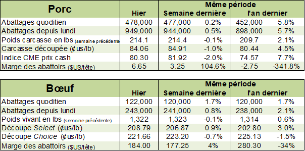 Le nombre de bouvillons abattus cette semaine s’établit à 243 000 têtes en hausse de 7000 têtes par rapport à l’an dernier. Le prix au comptant cette semblait se négocier dans la fourchette de $110 et $113.