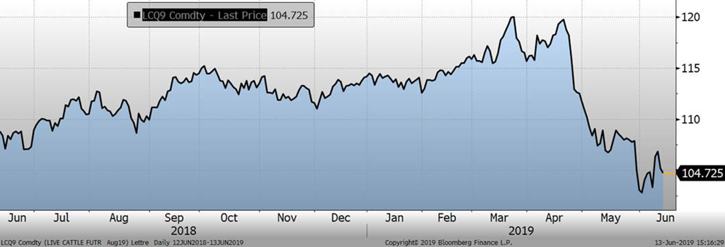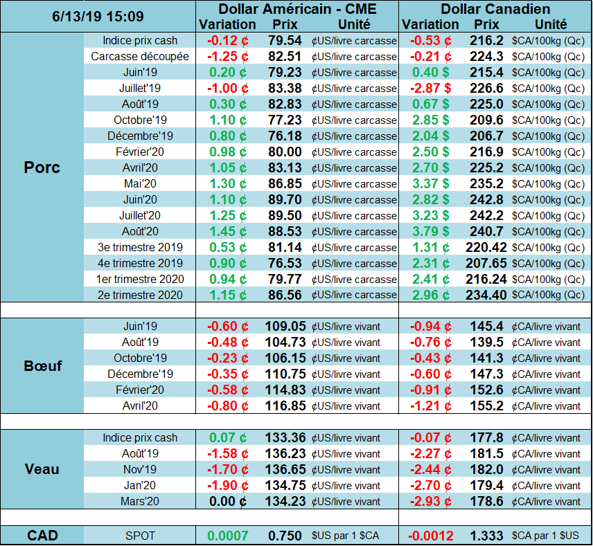 Le USDA a rapporté que les exportateurs ont conclu des ententes de ventes de viande de bœuf à une hauteur de 16 400 tonnes métriques, un chiffre qui demeure un peu décevant. Mardi dernier, l’organisme américain diminuait un peu la production de viandes bovines pour l’année 2019 (dernier trimestre de 2019). Ce changement n’a eu aucun effet sur le marché qui semble baisser en boucle depuis maintenant 2 mois. Malgré le rebond des prix depuis le début du mois de juin, les prix repartent à la baisse en raison du manque de conviction des consommateurs américains dans les supermarchés. Les détaillants peinent à vendre les inventaires constitués au printemps. De plus, le manque de belles journées estivales n’encourage pas la consommation. Malgré l’arrivée prochaine de la Fête nationale américaine, les grossistes ne proposent pas d’offrir de meilleurs prix aux abattoirs et par conséquent aux éleveurs.