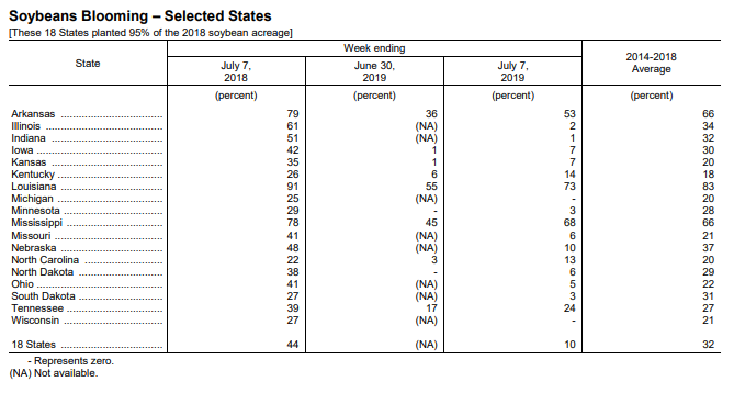 Constat similaire pour le soja. C’est incroyable de penser que l’USDA publie encore des progression de semis… EN JUILLET ! Je me demande bien qui sème des fèves rendu en juillet. Le soies de blé d’inde sont en retards, eh bien la floraison du soja aussi. Au niveau national ils sont à 10% en floraison, et normalement c’Est à 32%. Comme de fait, le soja n’est pas très beau, en baisse de 1% il est 53% bon/excellent.