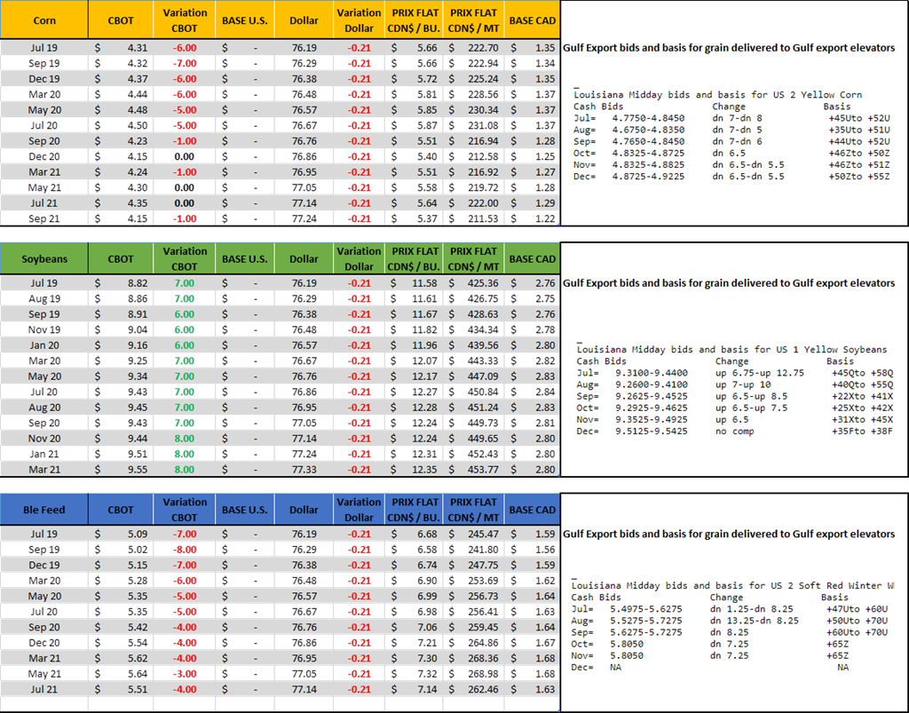 - Toute les questions concernant le rendement sont difficiles à répondre. Je trouve que cette année la dimension « assurance » est très importante, plus que les autres années à cause des retards dans les semis et les implications du paiement contre la guerre commerciale « MFP » de mon chum Donald Trump. Deux types d’assurance; 1) au printemps pour le prevented planting PP et 2) à l’automne pour les pertes de rendement ou prix (sorte d’assurance stab en bon québécois). Donc si les cultivateurs ne se sont pas prévalu du PP au printemps en se disant qu’ils prennent une chance que le marché monte et/ou que Trump donne des $$$, alors on switch au 2e type qui garantit un revenu sous forme de rendement/prix. Évidemment cela s’applique pas à tous les cultivateurs, mais ceux qui ont ce type d’assurance et je suis certains qu’il y a d’autre clauses aussi… Bref la logique c’est que le farmer peut assurer un rendement normal APH (Actual Production History) qui lui garantit un revenu basé sur le prix d’automne, et non le prix de printemps comme dans le cas du PP. Si le prix du maïs est de 5 $, les agriculteurs l'utiliseront grâce à leur assurance revenu. On estime qu’une bonne partie du Midwest aura des rendements inférieurs à l’APH, de sorte que si le rendement augmente, cela profite à la compagnie d'assurance plutôt qu'à l'agriculteur car le cout de dédommagement est plus petit plus le rendement est bon. Cela va à l’encontre de la logique habituelle, car les agriculteurs se débrouillent généralement pour obtenir le rendement le plus élevé. Cela signifie que des choses comme l'ajout d'azote ou l'application d'un fongicide n'auront aucune incidence sur le revenu de l'agriculteur, car elles réduiront le versement de l'indemnité. Très simplement, si le cultivateur pousse son rendement, cela lui coute en cout de production, mais cela profite juste à l’assureur qui réduire l’enveloppe par rapport au rendement normal. Bref, en « abandonnant » le cultivateur économise sur l’engrais/herbicide/fongicide et laisse l’assurance payer pour la différence.