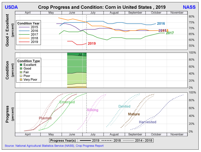 - Le chef-économiste de l’USDA, Robert Johansson, a indiqué récemment que le rapport du 11 juillet “will reflect weekly crop progress data and be more refined than prior reports.” En gros ça veut dire que le rapport de jeudi pourrait être plus raffiné inclure des révisions/observations plus reliées au rapport de lundi sur la qualité (good/excellent). Je ne sais pas si cela va être raffiné qu’un Bordeau rouge millésime 1982, mais on verra bien. L’élément de surprise jeudi viendrait donc d’un rendement révisé (possiblement?) à la baisse. Les analystes s’attendent déjà à une baisse de 1 BPA, mais peut-être que ça serait plus? L’USDA a déjà été très agressive en juin par contre… le sera elle encore en juillet? La conditions des cultures est une des pires depuis 5 ans, est-ce que le 166 BPA de juin reflète bien ou faut-il encore couper? Je n’ai pas la réponse, mais si on se fie à M. Johansson, il y a une chance de voir le rendement bouger en juillet, ce qui serait une chose inhabituelle et surprenante. Normalement les révisions viennent en aout, suite aux observations réelles dans les champs (population, poids spécifique, etc…).