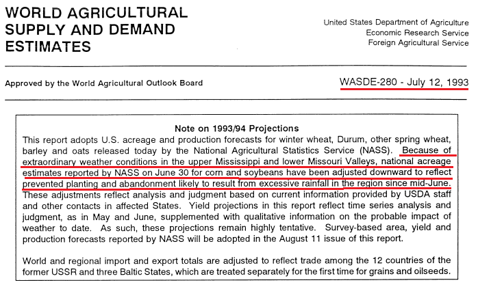- Même chose pour les acrages. Non, pas exactement la même chose, mais le résultat est similaire disons. L’USDA ne changera fort probablement pas les acrages semés, mais ils pourraient jouer avec les acrages récoltés. C’est une nuance, mais elle est importante. Cette nuance suggère une plus petite récolte car certains champs pourrait être abandonné, ou récolté en ensilage. Bref, c’est ce qui est arrivé en 1993 (autre grand retard de semis dans l’histoire). En 1993 cela représentait environ 0.8 million d’acre. Ce n’est pas des quantité phénoménales, mais cela s’additionne.