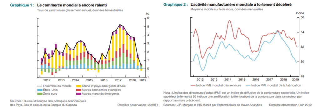 Du côté de l’économie mondiale, c’est évidemment l’escalade des conflits commerciaux et des tensions géopolitiques qui inquiètent. Dans le capitalisme, tout repose sur la confiance… Donc ces inquiétudes se répercutent par un ralentissement de l’activité économique mondiale, particulièrement dans le secteur manufacturier (économie émergente), ainsi qu’un ralentissement de l’investissements des entreprises. Un effet de ces inquiétudes entourant la croissance est un pression négative sur les prix des produits de base ce qui n’est pas favorable à une économie comme celle du Canada.
