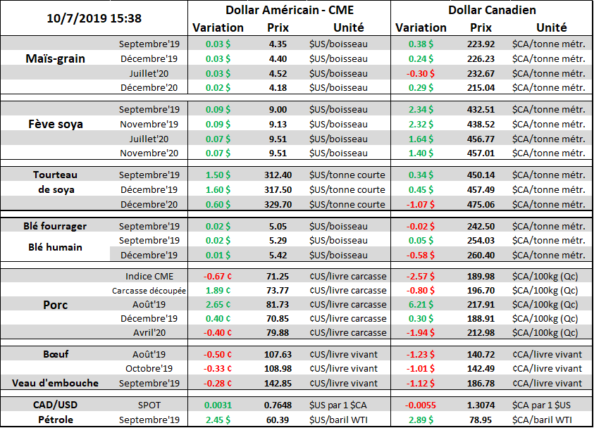 À 10h00, la Banque du Canada (BdC) publiait son taux directeur lequel demeure à 1.75%, tel qu’anticipé par le marché. Bien que l’économie canadienne se remet des difficultés éprouvées à la fin 2018 / début 2019, ce qui a permis à la BdC d’augmenter récemment les perspectives pour la fin de l’année 2019, l’économie mondiale continue d’inquiéter. Le ton utilisé par Poloz, gouverneur de la Banque du Canada, était plus prudent que dans ses derniers discours ce qui à fait reculer le CAD après l’annonce à 10h00, mais ce fût de bref et le CAD est retourné dans les hauts de la journée en après-midi.