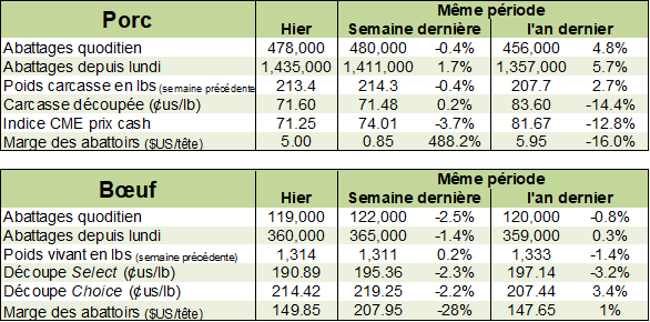 Encore une fois le cœur de la débandade demeure la faiblesse du prix de la découpe. Hier encore, celle-ci perdait $2.17 USD / 100 livres pour se situer à 71.60 USD / 100 livres et baissait de $1.40 ce matin à seulement 70.20. Ce prix demeure sans nul doute le pire depuis des 10 dernières années pour un mois de juillet. Le prix au comptant vient de tourner de sens alors que la plus récente publication du USDA faisait état d’une hausse de 0.09 USD / 100 livres. L’indice au comptant se situe maintenant à 70.69 USD / 100 livres.
