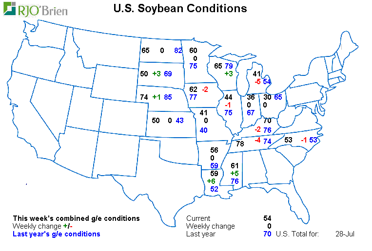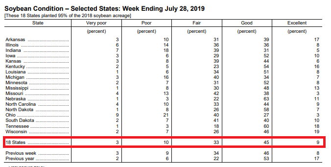 - Soja : 54% good/excellent vs 54% semaine passée et 70% l’an dernier