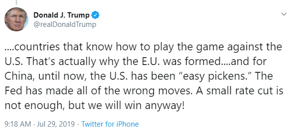 Par contre, Donald veut baisser les taux et ne se gêne pas pour s’ingérer dans les politiques monétaires. C’est du jamais vu qu’un Président se mêle (critique… ou même envoie promener pour rester poli) des politiques monétaires et du rôle des Banques Centrales. En fait, l’indépendance entre le gouvernement élu et les banques centrales est justement pour garder l’équilibre et faire en sorte qu’il n’y ait pas de dérapage. M’enfin, avec Donald tout est possible et chaque jour qui passe est du « jamais vu ».