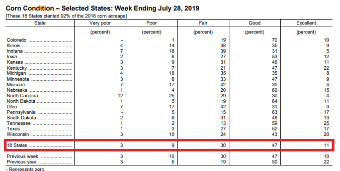 - Corn : 58% good/excellent vs 57% semaine passée et 72% l’an dernier