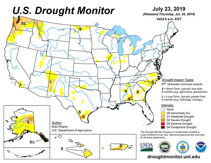Cartes Météo : certaines régions du Midwest pourrait prendre une journée de pluie, mais les cartes de sécheresse ne sont pas en train de beeper et flasher comme en 2012. Les forecast sont quand même clément jusqu’à la mi-août avec une absence de chaleur extrême. Coté précipitation, comme je le disais, ça ferait pas de mal un p’ti nuage.