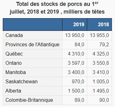 Les producteurs de porcs ont fait état de 14,0 millions de porcs, en baisse de moins de 0,1 % par rapport au 1er juillet 2018. Il s'agit d'une deuxième baisse consécutive d'une année à l'autre. Cependant, le niveau des stocks de porcs est demeuré 10,8 % plus élevé que celui de la décennie précédente.