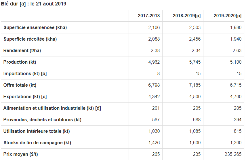 Le Conseil international des céréales (CIC) prévoit que la production mondiale de blé dur chutera de 1,6 Mt par rapport à 2018-2019 pour s'établir à 36,5 Mt, tandis que l'offre diminuera de 1,4 Mt pour s'établir à 45,9 Mt. L'utilisation devrait diminuer de 0,3 Mt et atteindre 37,6 Mt, l'augmentation de l'utilisation alimentaire étant plus que compensée par la baisse de l'utilisation fourragère. Les stocks de fin de campagne devraient chuter de 1,2 Mt pour s'établir à 8,2 Mt, leur plus bas niveau depuis 2014-2015. Le département de l'Agriculture des États-Unis (USDA) prévoit une production de blé dur américain de 1,56 Mt, soit une diminution de 0,54 Mt par rapport à 2018-2019.