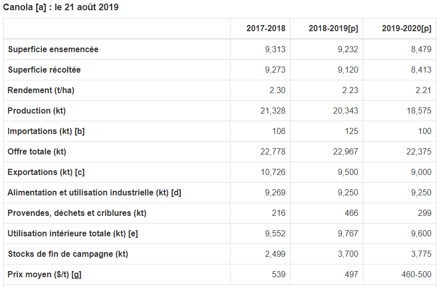 En 2019-2020, la superficie ensemencée en canola a reculé de 8 %, selon l'Enquête sur les superficies ensemencées de Statistique Canada, pour atteindre le plus bas niveau en trois ans. Au total, 55 % de la superficie de canola se trouve en Saskatchewan, 28 %, en Alberta et 15 %, au Manitoba. La production est prévue à 18,6 Mt, en supposant des taux d'abandon des cultures et de rendement normaux. Après un printemps frais et sec, les conditions de croissance se sont améliorées vers le milieu de l'été dans la plus grande partie des Prairies, en raison de l'humidité accrue et du réchauffement de la température. Statistique Canada a publié sa première estimation de la production de canola canadien le 28 août, qui reposait essentiellement sur les enquêtes auprès des producteurs.