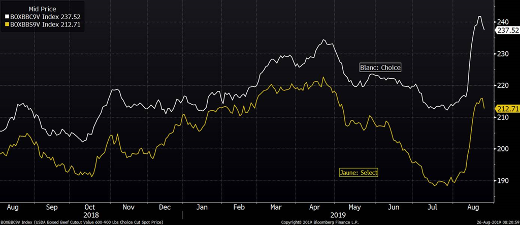Vendredi après la fermeture des marchés, l’USDA publiait le rapport Cattle-on-Feed lequel démontrait beaucoup moins de placements que prévus. Cela s’explique fort possiblement par la très bonne condition des pâturages aux États-Unis suite au printemps pluvieux. On pense toujours que la disponibilité de bœuf vers la fin du 1ertrimestre de 2020 sera limitée et offre un potentiel haussier sur les contrats de février et avril 2020. Concernant le résultat du rapport, les placement était 2.1% moins qu’en juillet 2018 alors que le marché s’attendait à la même quantité. La commercialisation était 6.9% plus élevé que l’an dernier versus des attentes de +6.4%. Avec moins de placement et plus de sortie, inévitablement, la quantité de bœuf en parc est moindre qu’anticipée. Au 1er août, il avait 11.11M têtes en parc d’engraissement aux États-Unis, en hausse de 0.2% versus l’an dernier.