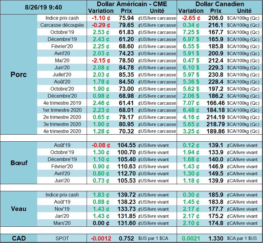 Pendant ce temps, le prix du porc aux États-Unis progresse dans la direction inverse qu’en Chine. Avec un limit down, vendredi suite à l’annonce de la Chine qui ajoutera 10% de taxe sur le porc américain, le prix des contrats a atteint un nouveau creux à la fermeture de vendredi. Suite à cela, vendredi soir, Trump annonçait une augmentation des taxes sur les importations chinoises en réponse à la Chine. En conséquence, les marchés financiers ont ouvert dimanche soir en panique ce qui n’augurait pas bien pour le marché du porc également. Toutefois, on ne peut rien prendre pour acquis avec Trump qui a annoncé durant la nuit que la Chine l’a contacté afin de reprendre les négociations… bref, en moins de 24h, on passe de la panique à l’euphorie sur les marchés financiers ce qui rend la climat très incertain. Aussi, pendant le G7 ce weekend, le Japon et les États-Unis ont annoncé d’importants avancements dans leur discussion sur le commerce ce qui pourrait mener à un nouvel accord qui serait notamment favorable pour les exportations de porc américain. Sur la « réconciliation » des États-Unis avec la Chine ainsi que l’accord avec le Japon, le marché du porc a ouvert à la hausse de 2.5 cents/lb ce matin sur octobre. Notez que la limite est de 4.5 cents/lb aujourd’hui.