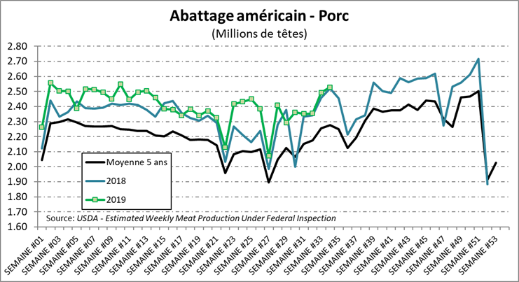 Concernant la production de la semaine dernière, les États-Unis ont abattu 2.53 millions de porc, soit l’une des plus grosses semaines de l’année jusqu’à maintenant. Ce volume est 0.3% plus élevé que l’an dernier. Aussi, on voit le poids qui continue à chuter, restreignant la production. C’est la première fois depuis le printemps que le poids des carcasses est au même niveau que celui de l’an dernier, soit 208 lbs/carcasse. En conséquence, la production était de 525.8 millions de livres, à peine 1M de plus que l’an dernier (+0.2%).