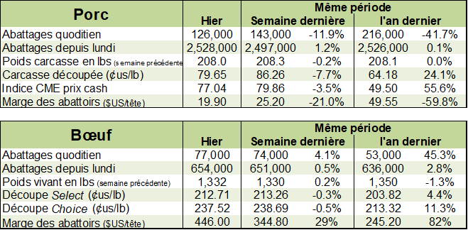 L’effet de l’abattoir fermé de Tyson cause un refoulement dans la livraison des bœufs. Le poids des animaux livrés aux abattoirs la semaine dernière a légèrement augmenté. On parle d’un gain de 2 lbs/vivant et carcasse à 810 lbs/carcasse et 1332 lbs/vivant. Les abattages étaient de 645,000 têtes, en hausse de +1.9% versus l’an dernier ce qui met la production à 528.7M têtes.
