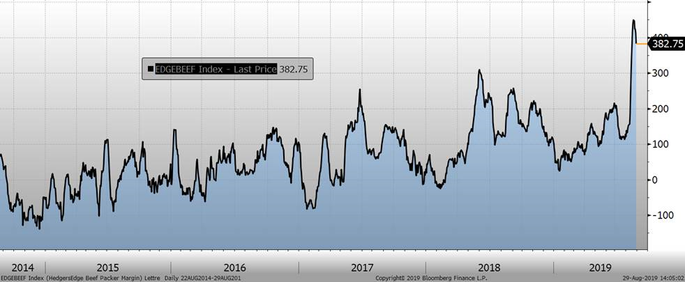 Parallèlement au phénomène de baisse de la découpe, le prix au comptant entreprenait sa baisse saisonnière avec quelques jours de retard. Le prix au comptant se situe à $70.23 USD / 100 livres. Pourtant, il est intéressant de mettre de l’avant le rythme d’abattage puisque plusieurs analystes s’attendent à une catastrophe pour la fin de l’année et croient à une explosion du nombre de porc mis en marché durant les 4 derniers mois de l’année. Depuis le 27 juillet 2019, les données d’abattages hebdomadaires par rapport à 2018 sont les suivantes : +3.05%, -0.3%, 0.13%, 6.1% et 1.44% la semaine dernière. Pour la semaine en cours, on se situe à 1.93%. La catastrophe sera-elle évitée si on suit cette tendance? L’an dernier, les creux saisonniers avaient été atteints durant la première semaine du mois de septembre, mais la baisse des prix avait débuté en juin. Peut-on s’attendre à voir des creux vers la fin de septembre cette année?