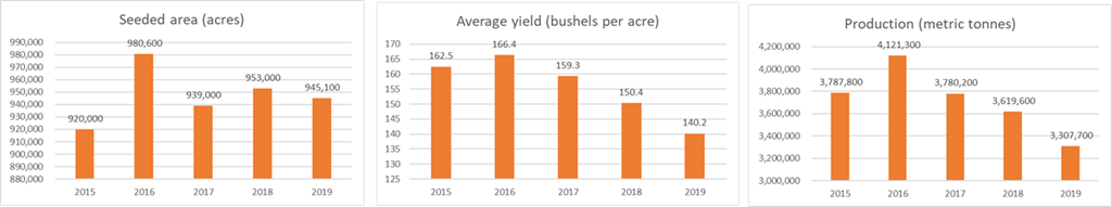 Les agriculteurs de l'Ontario, la principale province productrice de maïs-grain, s'attendent à ce que les rendements diminuent de 6,0 % par rapport à l'année précédente pour s'établir à 156,1 boisseaux à l'acre en 2019. La superficie récoltée devrait augmenter de 4,6 % comparativement à l'année précédente. Par conséquent, les agriculteurs s'attendent à ce que la production globale en Ontario diminue de 1,6 % pour s'établir à 8,6 millions de tonnes.