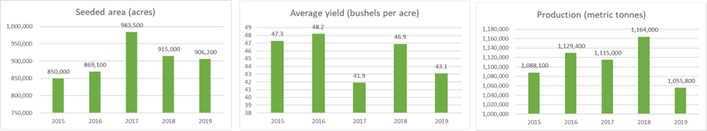 Au Manitoba, selon les estimations, la production de soya devrait diminuer de 18,7 % pour s'établir à 1,3 million de tonnes en 2019, principalement en raison d'une réduction de 22,3 % de la superficie récoltée. Toujours selon les estimations, les rendements devraient atteindre 32,5 boisseaux à l'acre en 2019. La diminution prévue de la superficie récoltée est attribuable à la décision des agriculteurs de la province de réduire la superficie ensemencée après avoir connu des rendements plus faibles pendant plusieurs années en raison des conditions sèches.