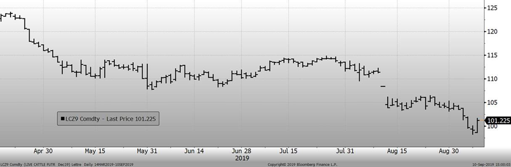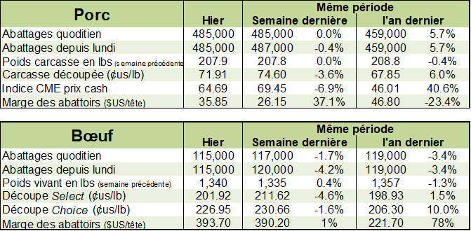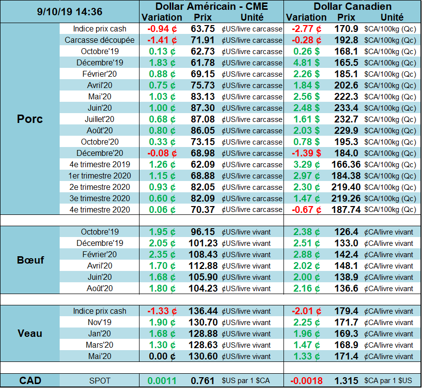 Un peu toujours les mêmes choses à dire sur le bœuf. Le prix au comptant continue de semer le trouble chez les éleveurs américains. Les régions de l’Iowa/Minnesota et Nebraska témoignaient de prix oscillant autour de $97 / 100 livres. Il faut rappeler qu’il y a peine 3 semaines, les prix se situaient près de $109 USD / 100 livres. Les abattoirs semblent profiter de la largesse du marché et augmentent ainsi leurs marges bénéficiaires. Pourtant, il sera intéressant de constater les ventes à l’exportations alors que la demande pour les viandes américains pourraient constituer une surprise de taille avant la fin de l’année 2019.