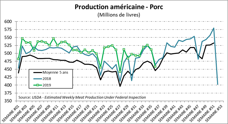 Une autre semaine de déception dans le marché du porc qui s’ajoute aux autres des dernières semaines. Pourtant, objectivement le prix mondial continue à progresser. Faut-il rappeler que le prix chinois est plus de 3 fois supérieur au prix américain présentement, soit l’équivalent de 500 $CA/100kg. Encore une fois tous les analystes chantent toujours la même chanson au sujet de l’augmentation de la production porcine prévue pour le restant de l’année 2019 aux États-Unis comme raison de la faiblesse des prix. Pour l’instant, la production n’est trop élevée avec seulement 2.2M porcs abattus la semaine dernière, en baisse de -0.8% versus l’an dernier. Aussi, le poids est inférieur à l’an dernier, à 208 lbs/carcasse, une première depuis le mois d’avril. En somme, la production de la semaine dernière était -1.2% celle de l’an dernier.