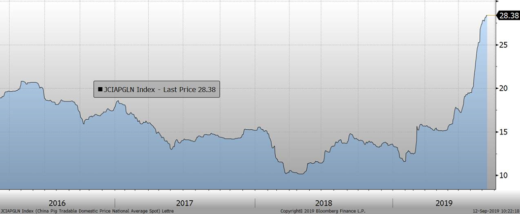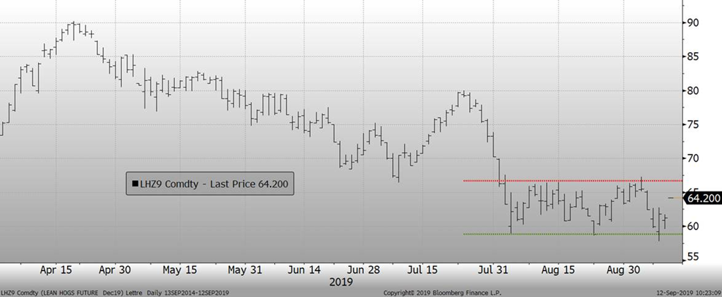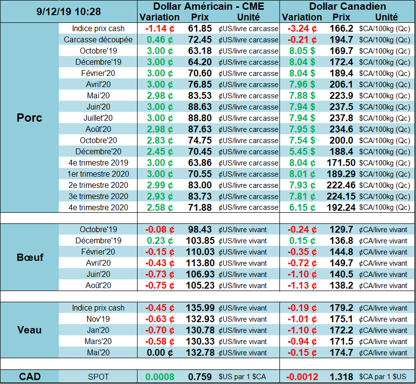 Ce matin, l’ensemble des contrats ont ouvert à la hausse de 3 cents/lb et certain ci transigent depuis plus d’une heure sans lâcher prise. Le marché devient très optimiste concernant les possibilités d’achat chinois. Hier soir, Trump a annoncé qu’il allait retarder de 2 semaines l’augmentation de 5% sur les importations chinoises, du 1er octobre à la mi-octobre, ce qui améliorera le climat de négociation pour les rencontres prévues au début octobre. De plus, le secrétaire américain au Trésor, Steven Mnuchin, disait hier qu’il y a eu des « progrès substantiels » dans les négociations avec la Chine. En réponse à ce geste d’amitié, la Chine a annoncé cette nuit qu’elle prévoit permettre aux entreprises chinoises d’acheter du porc et du soya américain, alors les entreprises chinoises boycottent le marché américain pour l’instant. Face à ces avancements, la marché du porc américain devient très optimiste.