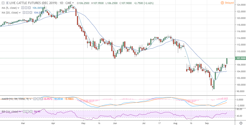 La publication du dernier rapport Cattle-on-feed vendredi dernier donne des ailes aux marchés des contrats à terme de bœuf aujourd’hui. En effet, le nombre de veaux placés dans les parcs a diminué de 9% par rapport aux mêmes données en 2018. Les analystes prévoyaient une baisse de 5.7% Ainsi le nombre d’animaux totaux dans les parcs en août se situaient à la baisse de 1.3% versus des attentes à -0.7%. C’est la première fois depuis décembre 2016 que le nombre d’animaux est à la baisse par rapport à l’année précédente.