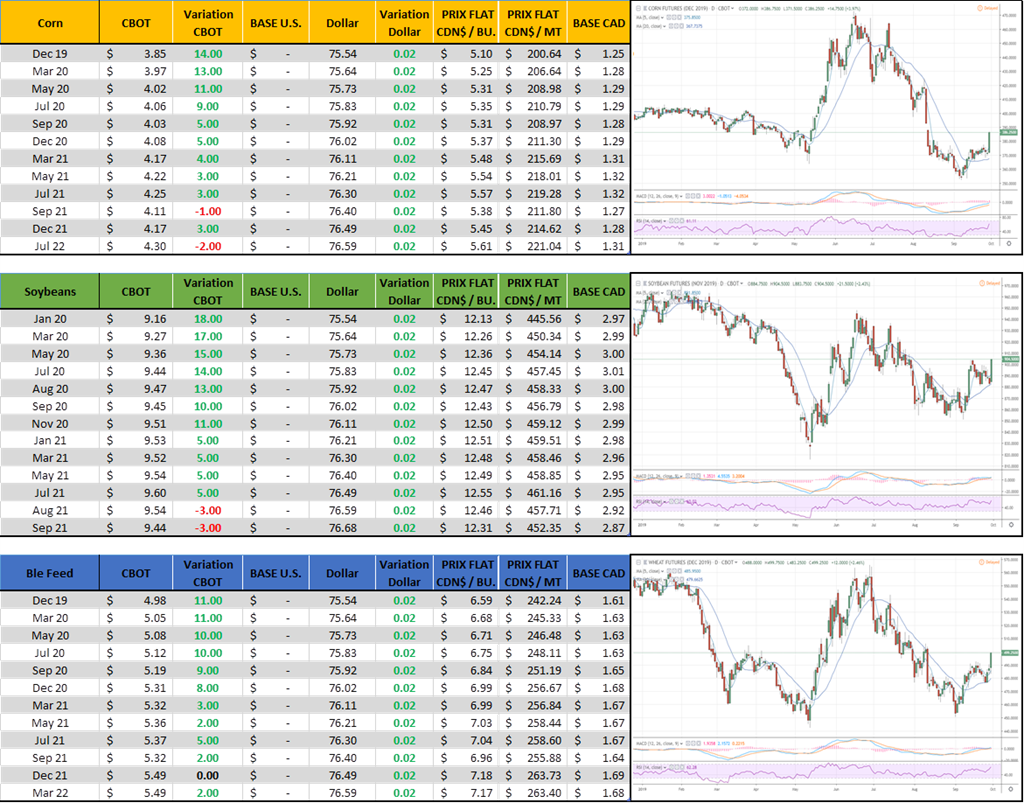Rapport USDA sur les inventaires de grain au 1er septembre. Le rapport ne contient pas de révision de rendement ou d’acrages – ce rapport offre/demande est jeudi prochain le 10 octobre. L’information d’aujourd’hui donne essentiellement les inventaires d’ancienne récolte qui seront roulé et disponible pour 2019/20.