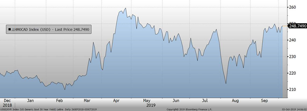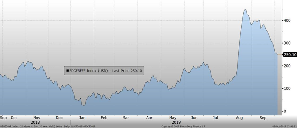 Les prix pour 2020 demeurent élevés malgré la petite correction des échéances à court terme. Le marché prévoit toujours que les exportations seront très élevées vers la Chine et l’Asie, mais les ventes à l’exportation de ce matin ne le démontrent toujours pas. La Corée du Sud a rapporté 2 nouveaux cas de PPA ce qui amène le total à 13 cas depuis le 17 septembre. Aussi, Rabobank croit que le troupeau chinois de porc sera en baisse de 55% d’ici la fin de l’année. À cela s’ajoute le Vietnam et les Philippines qui peinent à contrôler la maladie. Toutes des nouvelles qui abondent dans le même sens.