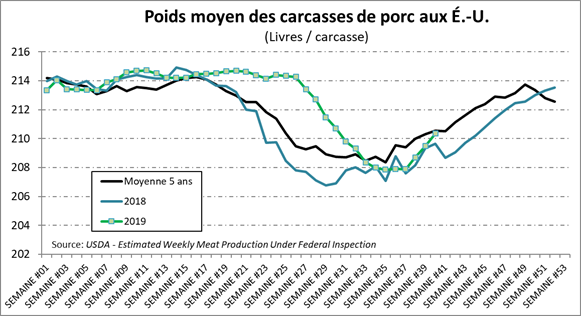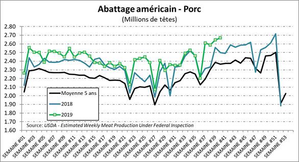La semaine dernière, les abattages de porc étaient de 2.67 millions têtes, un record en 2019 ainsi qu’un record pour cette période de l’année. Ça donne un avant-goût des abattages qui pourraient facilement surpasser 2.7M têtes/semaine à la fin de l’automne. C’est pratiquement 6.8% de plus d’animaux que l’an dernier. À cela s’ajoute le poids des carcasses qui accélère rapidement à 210.3 lbs/carcasse comparativement à 209.6 lbs l’an dernier. En somme, la production de viande de porc était de 561.4 millions de livres, en hausse de 7.1% comparativement à l’an dernier. C’est beaucoup de viande!! Depuis le début de l’année, la production de porc est de 20.5 milliards de livres, en hausse de +4.1% versus l’an dernier.