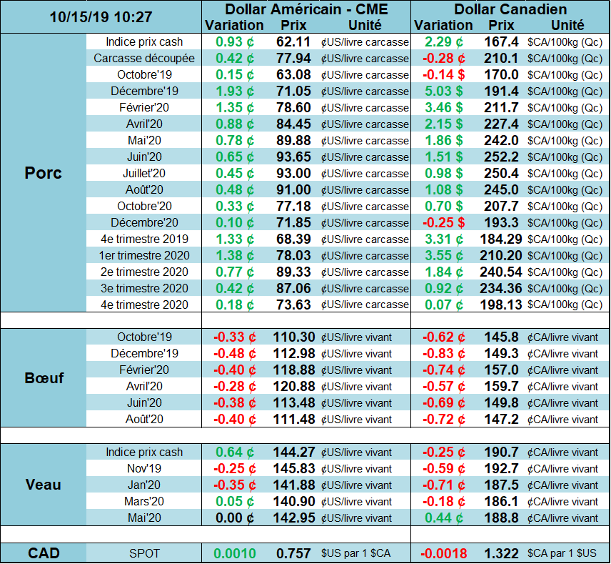 Le marché a commencé la journée sur un ton positif avec l’échéance de décembre qui gagne 2 cent/lb suite à quelques éléments positifs en Chine. D’une part, il y a eu de petits avancements dans la négociation de la guerre commerciale sino-américaine et finalement, Trump n’a pas augmenté le taux de taxation aujourd’hui, comme il s’apprêtait à faire avant la reprise des négociations. D’autre part, le prix en Chine continue de monter, présentement à 36 CNY/kg ce qui représente plus de 5.07 $US/kg… oui oui, 507 $US/100kg! Les statistiques d’inflation en Chine porte une mention particulière au prix du porc et la PPA, on voit donc que c’est un sujet très important en Chine. De plus, la ministère de l’agriculture en Chine rapporte une diminution de -41% du cheptel chinois comparativement au troupeau d’il y a 1 an, ce n’est donc pas surprenant de voir le prix exploser autant. Aussi, le nombre de truies est en baisse de -38.9% en septembre et on voit que le virus continue à prendre de l’expansion puisque le troupeau était en baisse de -38.7% en août et les truies en baisse de -37.4%. Selon les diverses discussions et analyses, on peut croire que la perte est au-delà des chiffres rapportés par le gouvernement chinois. Par exemple, Rabobank anticipe une baisse de -50% présentement et devrait aller jusqu’à -55% à la fin de l’année. Pendant ce temps, les grosses entreprises d’élevage prennent de l’expansion avec des investissements massifs pour reconstruire le cheptel en raison de la rentabilité actuelle en Chine.