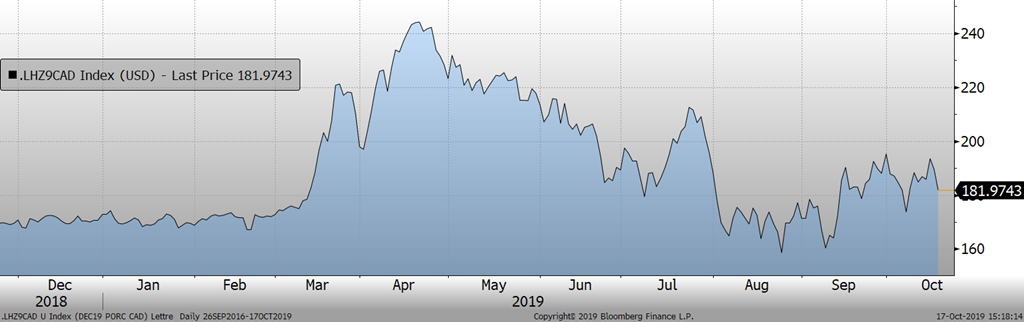 Le prix n’en finit plus de grimper sur les diverses échéances dans le bœuf. Les discussions au sujet des consommateurs américains qui puisent dans leur portefeuille pour finaliser des achats de viande de bœuf pour le temps des Fêtes ainsi que les analystes qui semblent convaincus de la possibilité d’exportations à la Chine qui sont grandissantes. Les prix sont à des sommets des 6 derniers mois. Un fait à noter; la production de viande de bœuf pour le dernier trimestre de 2019 sera en baisse par rapport au 3ieme trimestre, une première en 5 ans.