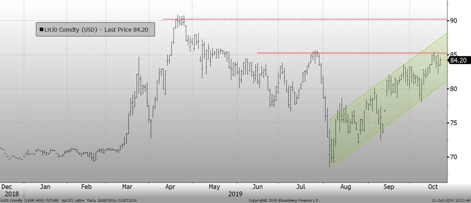 Le prix du bœuf a brisé la tendance baissière vendredi dernier en affichant une baisse de -1.9 cent sur octobre, mais seulement -0.75c et -0.48c sur décembre et février après avoir rebondit sur les supports techniques. Par exemple, l’ancienne résistance de 118c sur février a été défoncée avec un gap le 14 octobre. Cette ligne devient donc notre support technique et vendredi, le prix a effectivement rebondit sur ce support, preuve qu’il tient en place. Donc, en autant que les prix ne brise pas ces supports, c’est un marché qui reste plus intéressant à l’achat qu’à la vente. Une stratégie pour vendre pourrait être de mettre des ordres stop sous les supports technique.