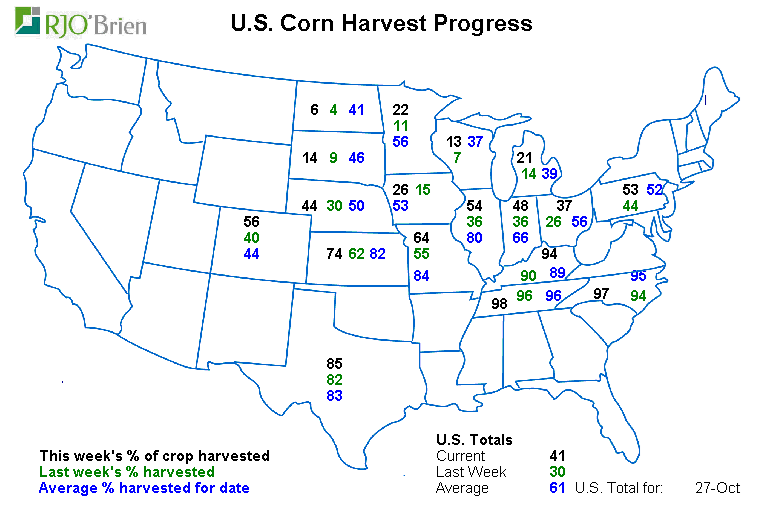 - Maïs : 41% récolté vs 30% la semaine passée et 61% en moyenne (retard)