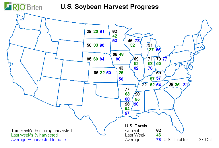 - Soja : 62% récolté vs 46% la semaine passée et 78% en moyenne (retard)