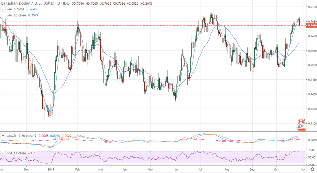 Dollar CAD : le taux de change CADUSD est le plus haut depuis près d’un an mais n’a pas su progresser au-delà des haut de cet été (juillet 76.75). La fermeture d’aujourd’hui pourrait être une clé de renversement mais je n’ose pas trop me prononcer car demain back-à-back les banques centrales mettent à jour les politiques monétaires (taux d’intérêt). Le marché obligataire s’attend à une baisse de taux USA (-0.25%) et un statu quo au Canada.