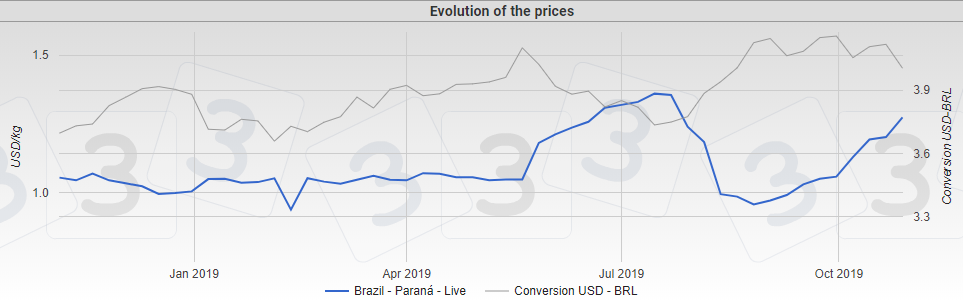Prix du porc vivant au Brésil (bleu = BRL/kg & gris = $US/kg)
