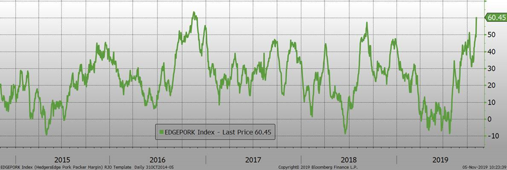 Hier, le prix des découpes de porc a gagné plus de 3c/lb à 78.75. Ce qui était particulièrement intéressant est que toutes les coupes se sont considérablement appréciées et que l’augmentation de la valeur du porc en boîte ne découlait pas seulement d’une ou deux coupes. Si le prix continue de progresser de la même façon cette semaine, ça pourrait démontrer que les acheteurs étrangers deviennent de plus en plus agressifs pour booker. Néanmoins, la force du marché des découpes ne se reflète toujours pas sur le prix cash qui continue sa baisse saisonnière du mois de novembre. Le résultat de la divergence entre le cash et les découpes est évidemment une augmentation de la marge des abattoirs, présentement à 60 $US/tête.