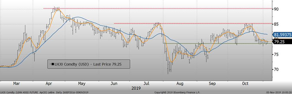 Techniquement, le prix du porc de 2020 est allé s’accoter sur le support formé par le gap de la mi-septembre. Par exemple, le CàT d’avril a un support technique à 78.00 / 78.50 c/lb et pour l’instant ce support tient. À l’inverse, on note que la tendance court terme est plutôt faible avec la moyenne mobile 5 jours qui reste en-dessous du 20 jours.