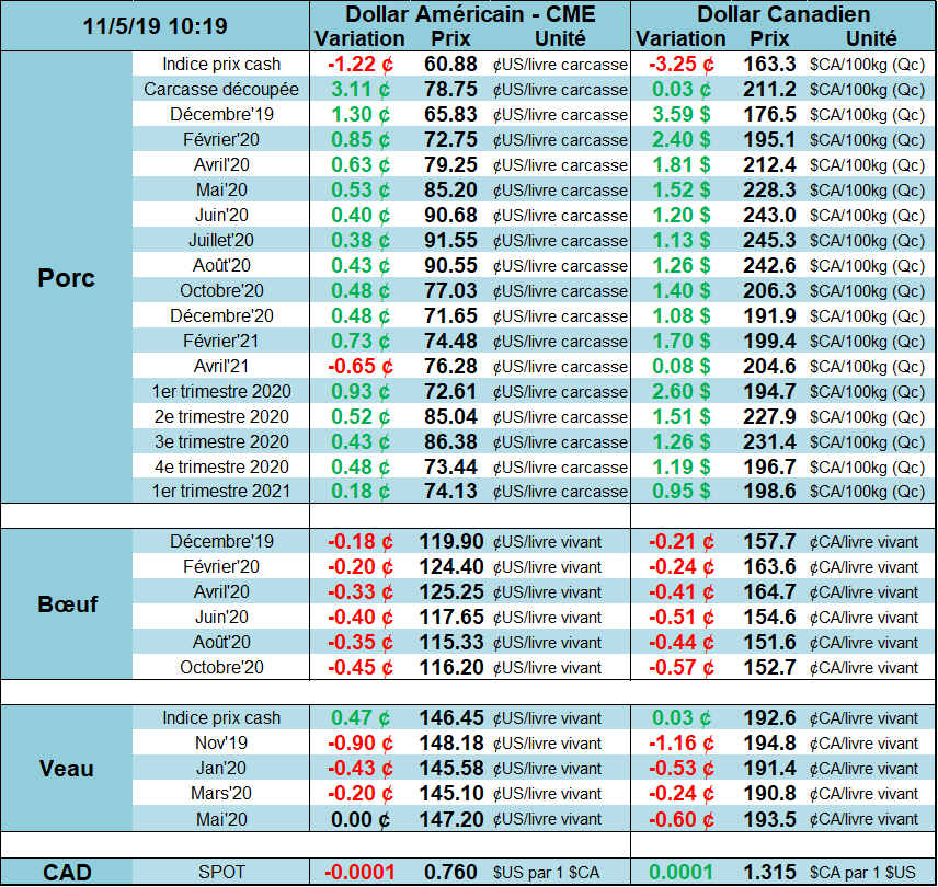 À l’international, la Chine a annoncé la fermeture de plusieurs petits abattoirs en raison du manque d’activité et ainsi restreindre les risques de propagation de la PPA. Il y a encore beaucoup d’abattoirs « artisanaux » qui sont en proximité de la production des villages. On concentrant les activités d’abattage dans les grosses usines, la Chine tente d’améliorer la biosécurité puisque le virus est toujours actif après la transformation de la viande. Par ailleurs, la Chine a annoncé hier l’approbation de 7 transformateurs de viande au Brésil, de l’état de Santa Catarina, dans le sud du Brésil. Cette approbation est effectif dès aujourd’hui ce qui démontre les besoins criant en Chine. Depuis 2 mois, le prix du porc au Brésil a augmenté de 0.97$US/kg vivant à 1.27 $US/kg, se rapprochant du sommet de l’été dernier.