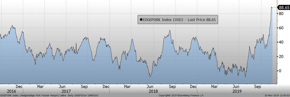 Le seul critère qui maintient encore les prix en alerte est la hausse du prix de la découpe qui a terminé la semaine à $88.13 USD /100 livres. Les prix du jambon et du bacon sont en forte hausse depuis 2 semaines maintenant et continuent de flirter avec les sommets des dernières années. Cette force indique vraisemblablement une bonne demande de la part des grossistes américains. Par conséquent, soit la demande des américains sera plus forte ou alors les exportations seront plus fortes (ou une combinaison des deux!). Aussi, cela gonfle la marge des abattoirs à des niveaux record, tout juste sous la barre du 90 $US/tête.