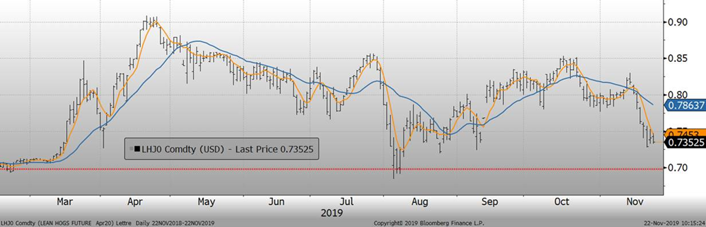 La Chine rapporte que son cheptel reproducteur a augmenté par +0.6% en octobre versus le mois précédent. C’est la première augmentation du cheptel à l’échelle nationale depuis avril 2018. De plus, sans de détail sur les chiffres, la Chine mentionne que la diminution du troupeau porcin ralentie. Pendant ce temps, la production de poulet à griller en octobre était en hausse de 16% versus 2018 ce qui devrait générer une augmentation de la production de volaille par 3 millions tonnes en 2019. Du côté des politiques sino-américaine, on navigue toujours dans l’incertitude. La phase 1 du futur accord commercial n’est toujours pas cédulé pour être signé en 2019 et on ne sait toujours pas si Trump augmentera les tarifs douaniers le 15 décembre. À cela s’ajoute le projet de loi qui a été voté mercredi quant à les droits de l’homme des hong-kongais et que Trump devrait éventuellement signer ce qui pourrait provoquer un réaction négative de la Chine.
