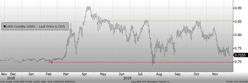 Le prix du porc jouait au yo-yo la semaine dernière alors que des indications contraire sortaient l’une après l’autres sur ce qu’adviendra l’augmentation des tarifs douaniers le 15 décembre… et on ne connait toujours pas la réponse à ce que Trump fera dans une semaine. Augmentera-t-il les tarifs pour mettre de la pression sur les négociateurs chinois ou va-t-il reporter afin de ne pas ternir la relation avec la Chine? Évidemment, le prix du porc risque de monter sur les nouvelles qui abondent vers un accord avec la Chine, l’inverse est également valable.