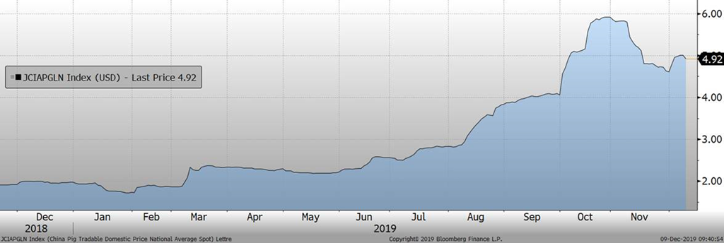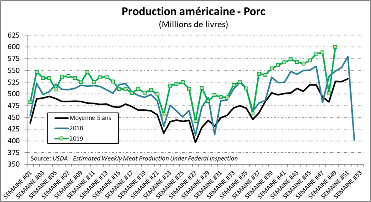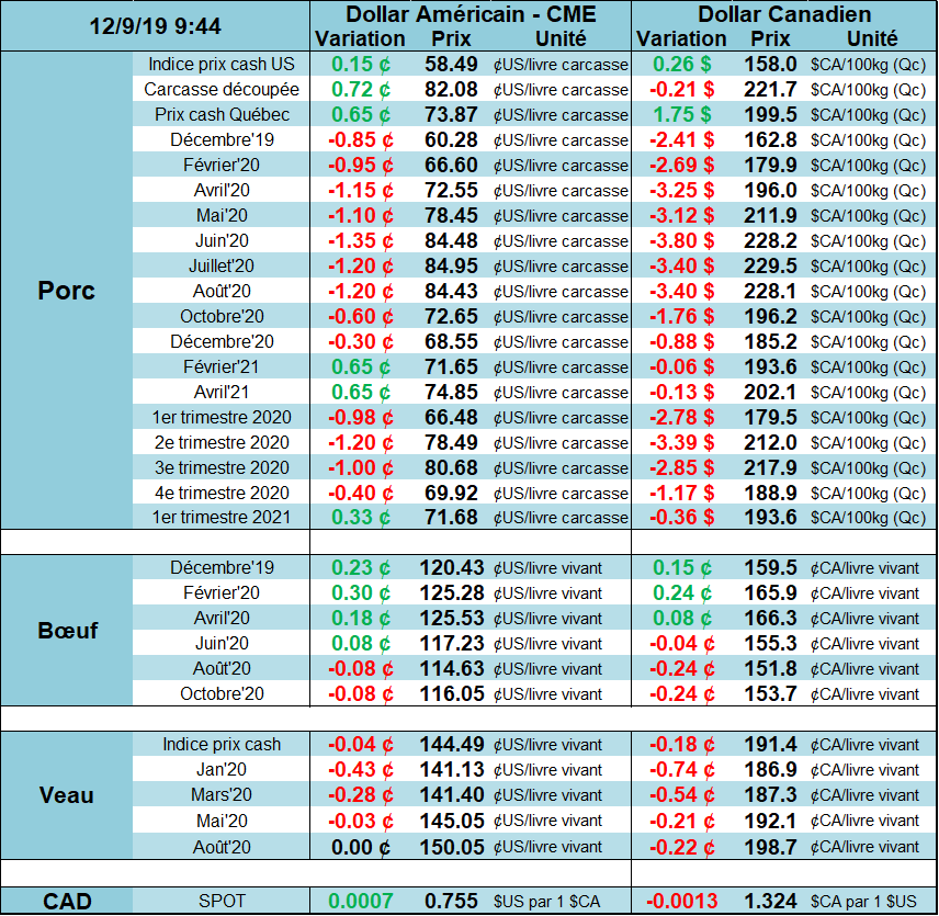 D’ailleurs, de nouvelles données sur le cheptel porcin chinois ont été publiées dernièrement. Selon le Ministère de l’agriculture et des affaires rurales, le cheptel de reproduction a augmenté de 4% entre octobre et novembre ce qui fait le 2ème mois consécutif avec une augmentation du troupeau de truies/cochettes. La production de porc a aussi augmenté entre octobre et novembre, par 6.9%!! Pour l’instant, l’offre de porc en Chine demeure très serré et le demeura pendant encore la première moitié de 2020. Évidemment, de voir une telle croissance dans la reconstruction du troupeau chinois vient donner une douche froide au marché lequel a ouvert à la baisse de -1.0 à -1.5 c/lb ce lundi matin.