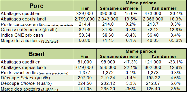 La semaine dernière, le prix du cash a montré des signes positifs avec 4 journées d’affilées dans le vert. Bien que le prix cash demeure à 58.5 c/lb, c’est une victoire en soi lorsqu’on considère la production de la semaine dernière. Pour une première fois, la production a surpassé la barre du 600 millions de livres en raison d’abattage record de 2.8 millions porcs. Concernant le prix des découpes, peu de changement ces derniers jours alors que la hausse de jeudi-vendredi est venue compenser la baisse de mardi, avec un prix qui avoisine toujours 82 c/lb. Avec la nouvelle formule de prix, on parle d’un prix à 200 $CA/100kg environ au Québec.